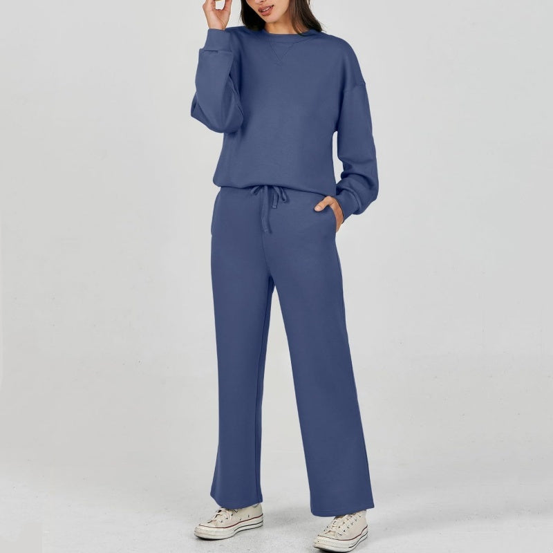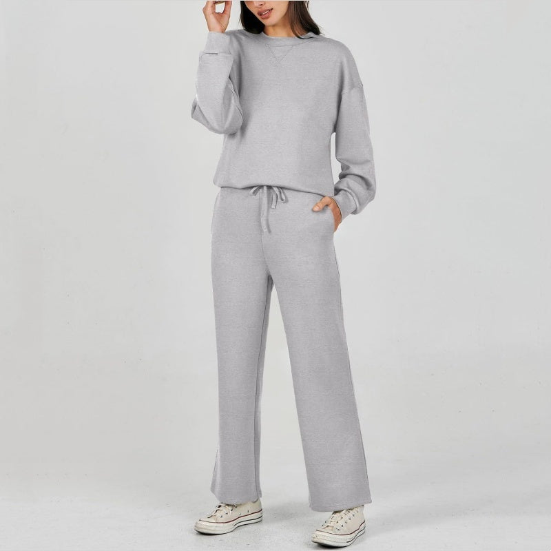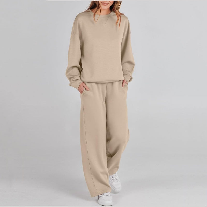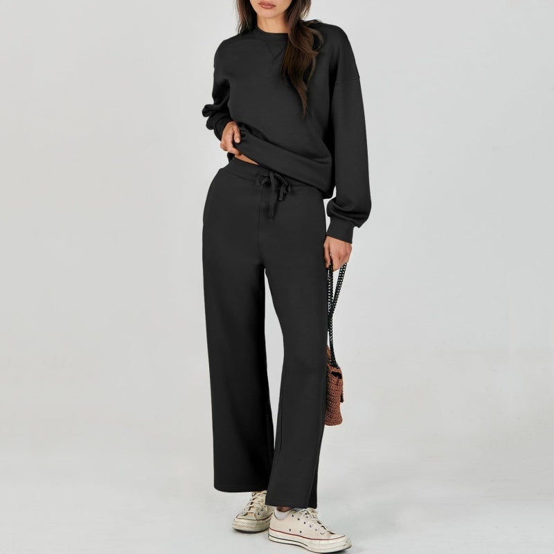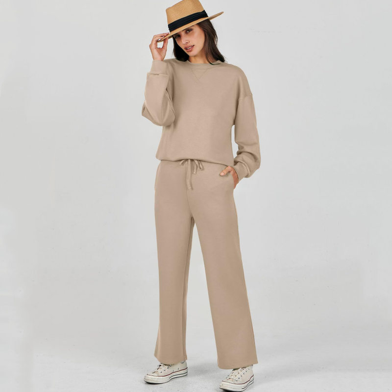 STYLOVÝ A POHODLNÝ DESIGN – Tato dvoudílná dámská tréninková souprava kombinuje uvolněný komfort s rafinovaným stylem. Souprava se skládá z trička s dlouhým rukávem a volným střihem a splývavých kalhot se širokými nohavicemi, které vytvářejí lichotivou siluetu.