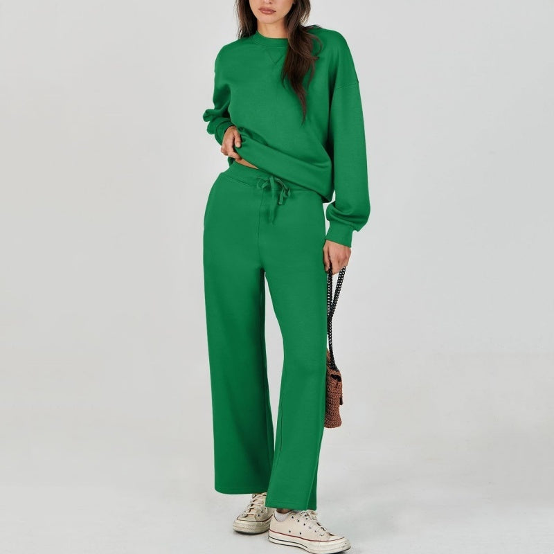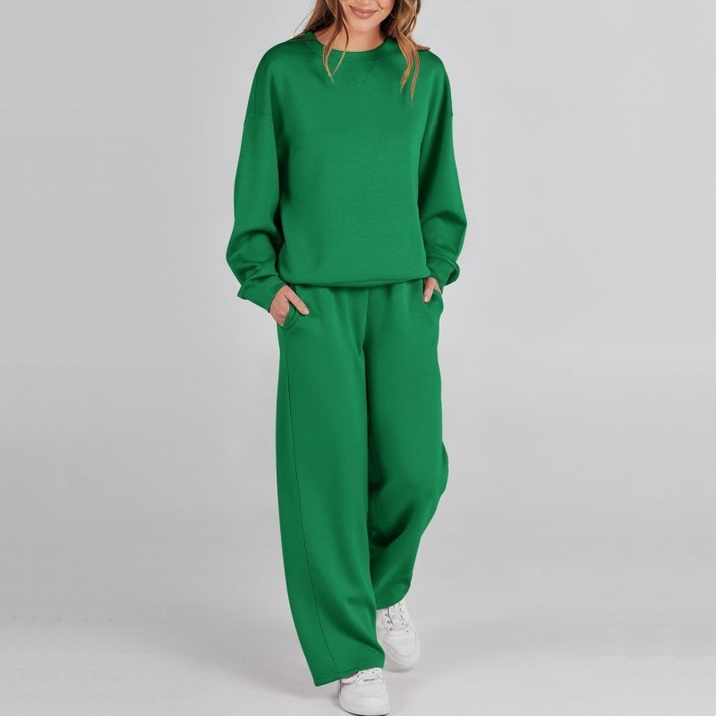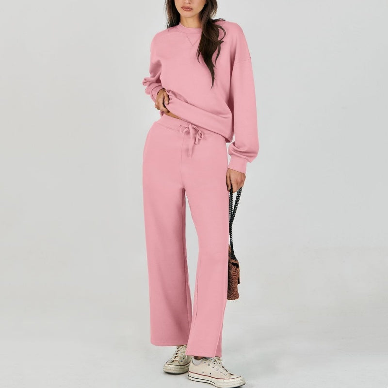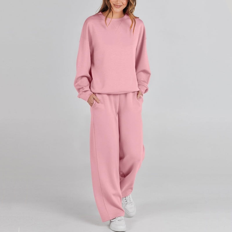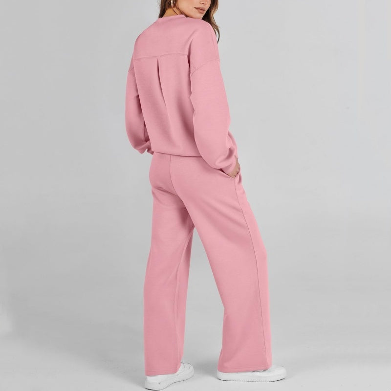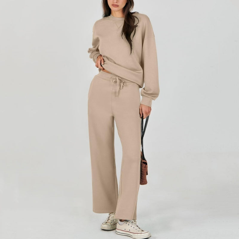 STYLOVÝ A POHODLNÝ DESIGN – Tato dvoudílná dámská tréninková souprava kombinuje uvolněný komfort s rafinovaným stylem. Souprava se skládá z trička s dlouhým rukávem a volným střihem a splývavých kalhot se širokými nohavicemi, které vytvářejí lichotivou siluetu.